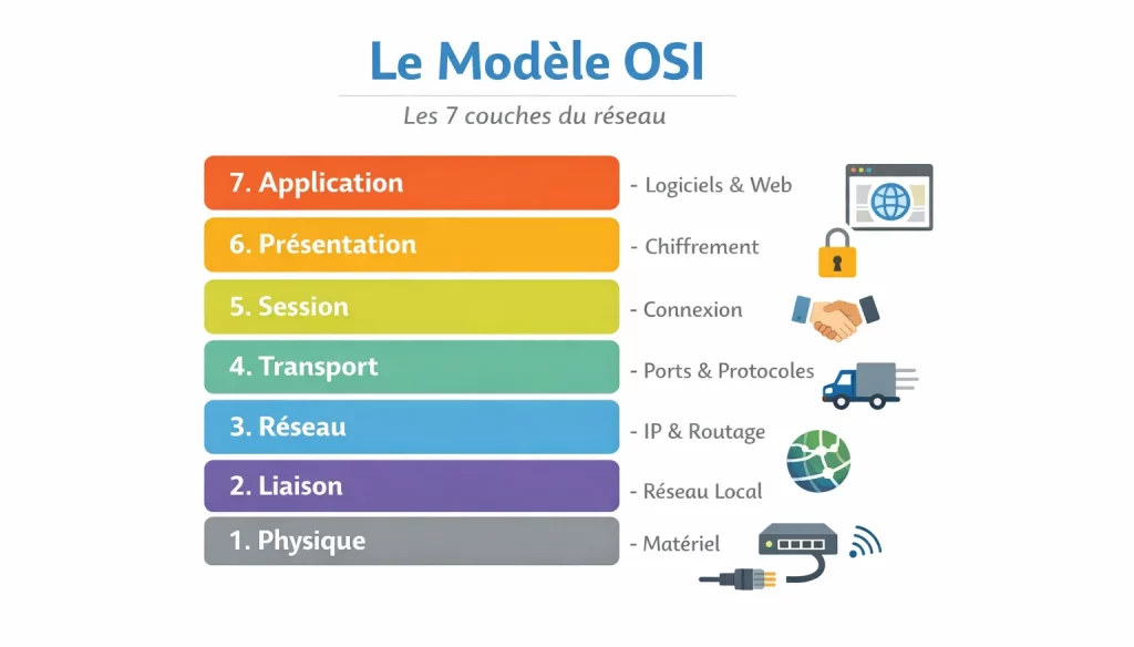 Le Modèle OSI vous permet de ranger tout ça dans des tiroirs. Chaque tiroir a un rôle précis. Résultat : vous apprenez plus vite, et surtout vous retenez mieux.